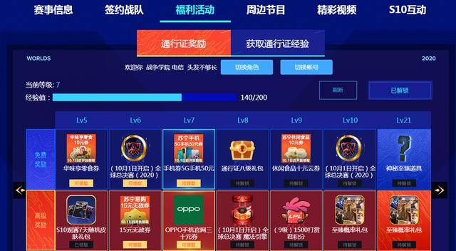 用户通过每日打卡、直播观赛等形式,免费积累经验值、升等级,即可解锁官方周边、游戏皮肤道具、直播平台货币和特权、苏宁易购消费优惠券等奖励。