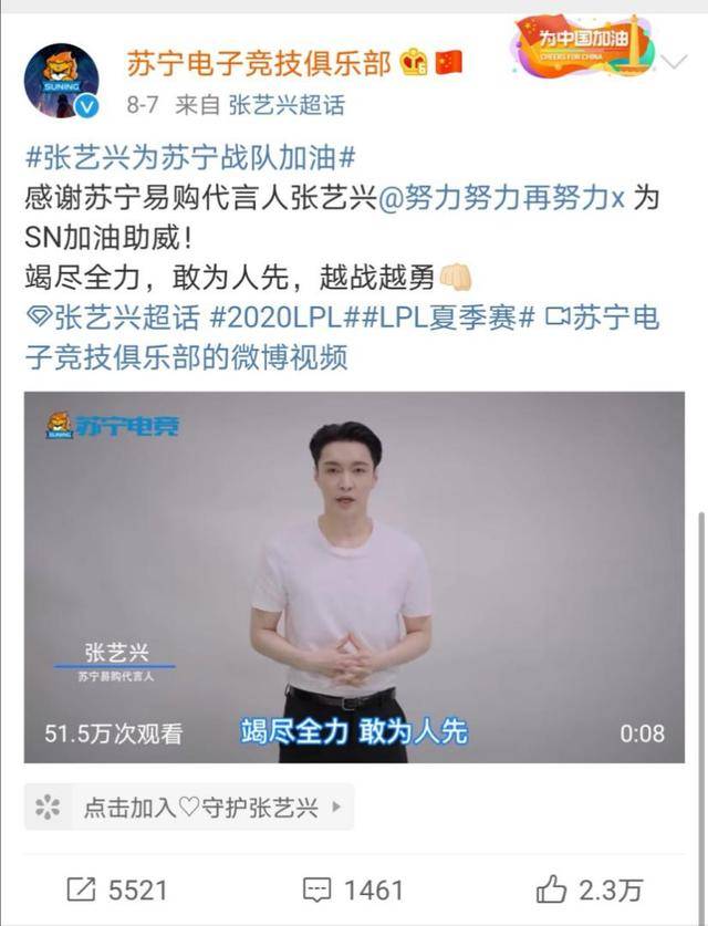 (图:苏宁易购代言人张艺兴为SN战队加油)