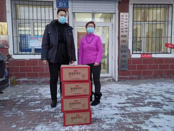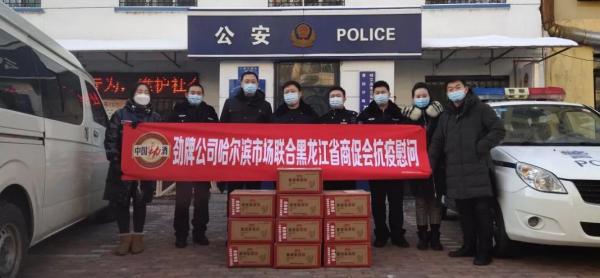 黑龙江省商贸工会主席、商促会秘书长申志国,副秘书长张艺凡带领常务会长单位亮起商贸公司董事长王海亮,劲牌公司总经理李小勇为香坊区珠江路派出所捐助《劲牌持正堂藿香紫苏饮》10箱,共400盒。珠江路派出所付凯所长代表辖区干警接收了防疫物资,并表示衷心感谢。