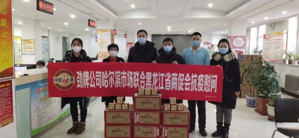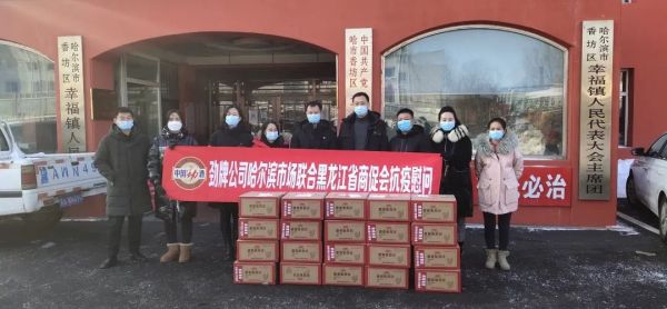 黑龙江省商贸工会主席、商促会秘书长申志国,副秘书长张艺凡带领常务会长单位亮起商贸公司董事长王海亮,劲牌公司总经理李小勇为香坊区幸福镇政府捐助《劲牌持正堂藿香紫苏饮》20箱,共800盒。香坊区幸福镇党委书记代清江和镇长张立君代表防疫工作人员接收了防疫物资,并表示衷心感谢。