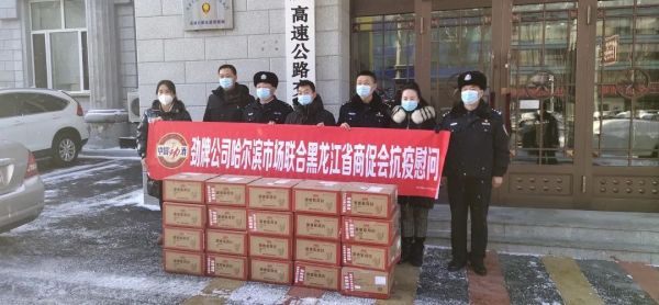 黑龙江省商贸工会主席、商促会秘书长申志国,副秘书长张艺凡带领常务会长单位亮起商贸公司董事长王海亮,劲牌公司总经理李小勇为省公安厅高速公路交通管理局捐助《劲牌持正堂藿香紫苏饮》20箱,共800盒。省公安厅高速公路交通管理局田凯政委代表高速交警接收了防疫物资,并表示衷心感谢。
