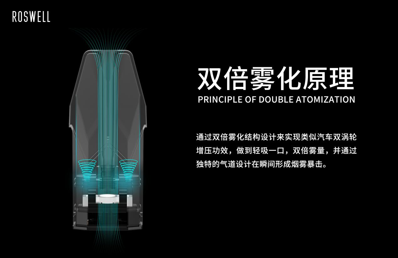 这款轻肺吸雾化器的设计思路不同于以往的传统结构,通过双倍雾化结构设计来实现类似汽车双涡轮增压功效,做到轻吸一口,双倍雾量,并通过独特的气道设计在瞬间形成烟雾暴击。“轻肺吸”系列双倍雾化技术助力雾化口感始终稳定如初;同时双倍雾化结构形成极度扩宽陶瓷加热表面,使雾化液360°快速且充分的受热,实现轻松抽吸就能感受细腻浓郁的香气、真实稳定的口感以及烟雾绵柔的丰沛雾量。另外还新增了冷凝回流系统,有效解决令人诟病的冷凝外漏,令抽吸感受更纯净更富有层次。虽说产品的结构原理比较枯燥,但所带来的感官感受提升是质的飞跃,背后是ROSWELL工程师们长达近两年的技术攻关累计。