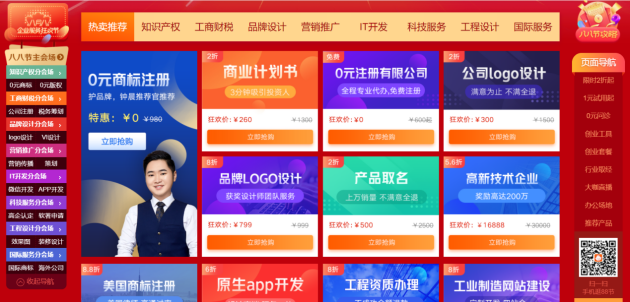 记者在活动主会场看到,产品取名、公司logo设计等多款服务正在以两折低价销售,还有商标注册、注册有限公司、政策咨询等多款产品可以享受0元抢购活动。此外,针对企业采购服务决策成本高等因素,今年“八八节”还特别推出了新品1元起试用活动,电商店铺诊断、电商产品图拍摄等多款产品均可1元试用。