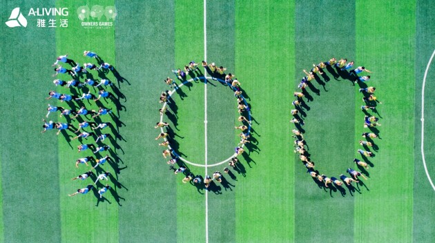 随着业主运动会火炬的燃起,在场观众热情高涨!五方代表组队排列、形成线条,航拍俯瞰组成了红色“100”的字眼。“咔嚓”一声,留下了“百年澎湃、美美与共”献礼建党100周年的纪念时刻!