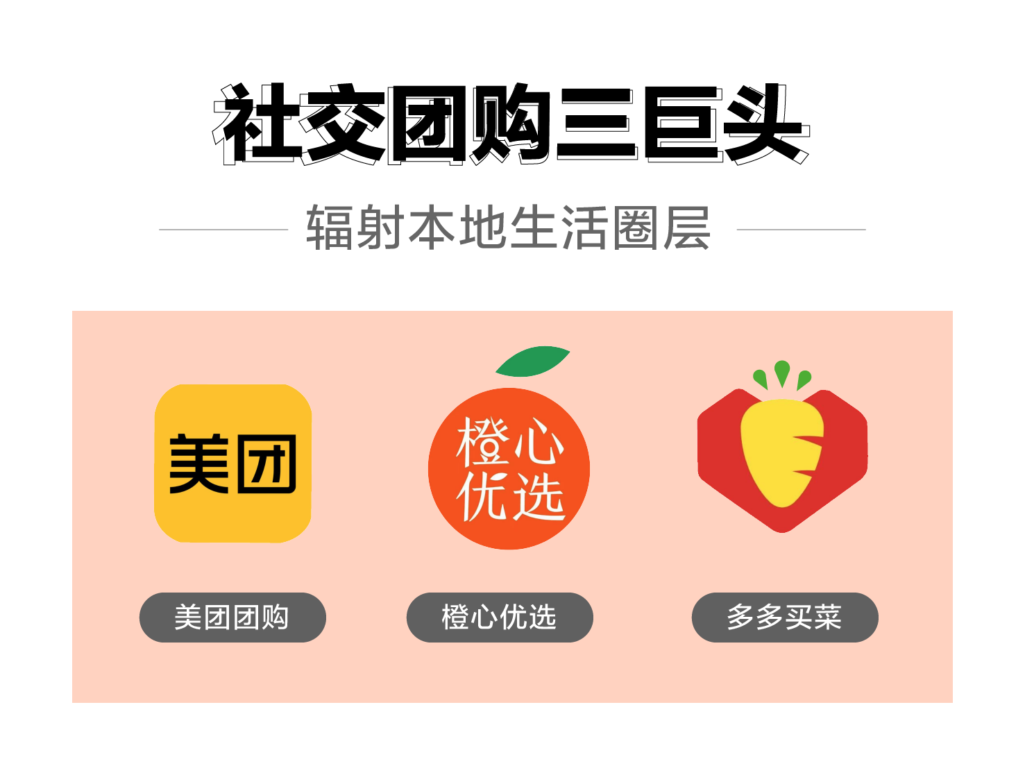 去年疫情影响下,美团团购、橙心优选、多多买菜三家巨头火速切入社交团购,迅速从原先的1.0模式过度,用户范围明显扩大,一二线城市居民的感受尤为明显,这几个变量在迅猛发展:
