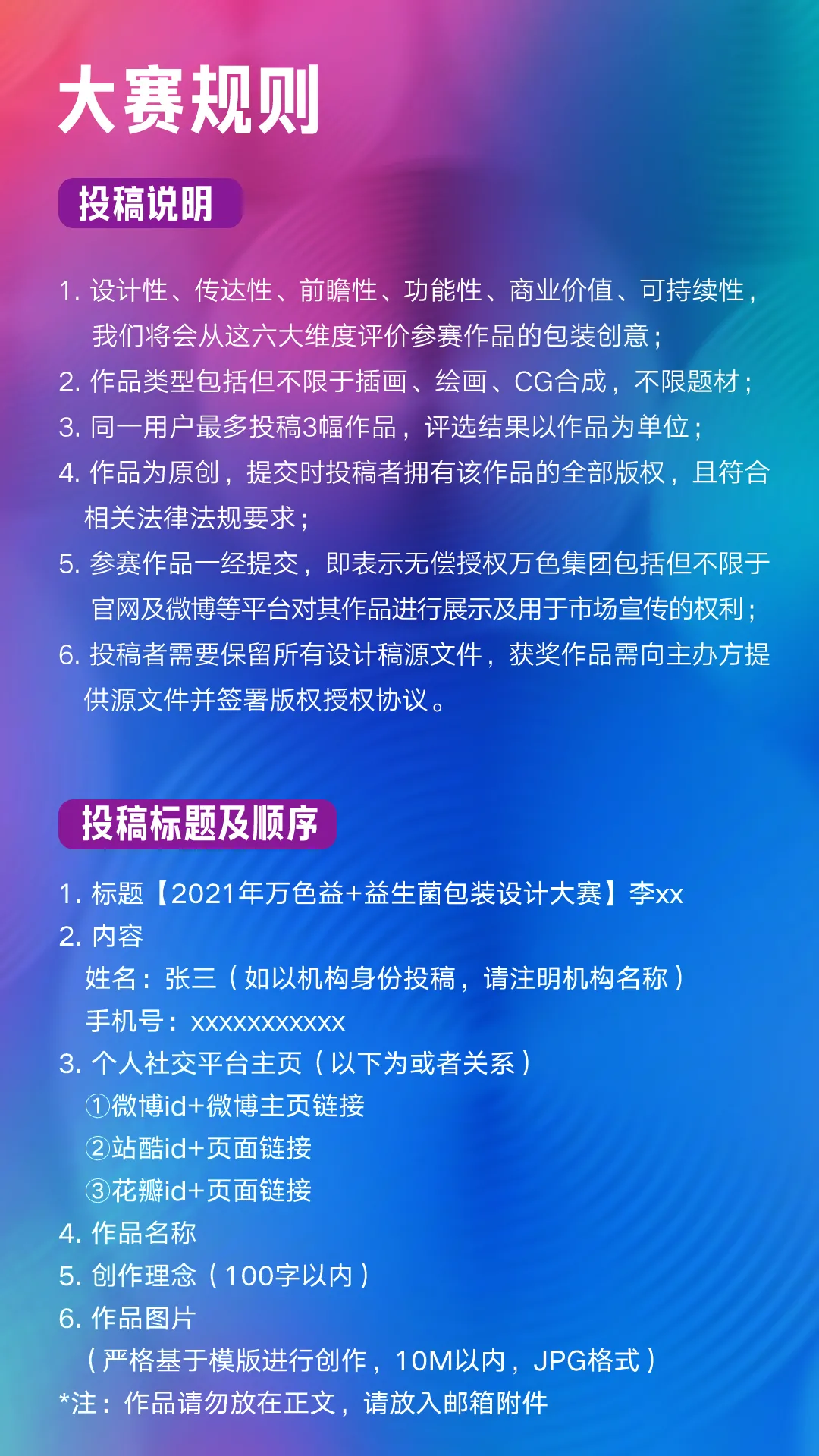 2、创作作品要符合万色城产业升级发展趋势,要具有前瞻性。所有作品都要符合万色城产业发展定位及万色益+益生菌品牌理念!