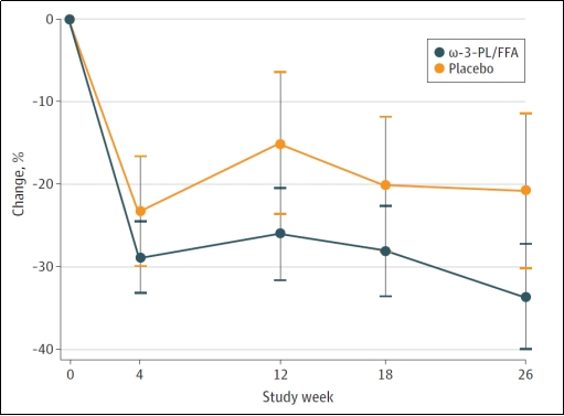 资料显示,该项研究使用了挪威阿克海洋生物公司提供的磷虾油,测试了磷虾油对520名血液中甘油三酯水平严重升高(高甘油三酯血症)患者的影响。结果表明,食用磷虾油的患者血液中甘油三酯水平在12周后降低了26.0%,在26周后则降低了33.5%。