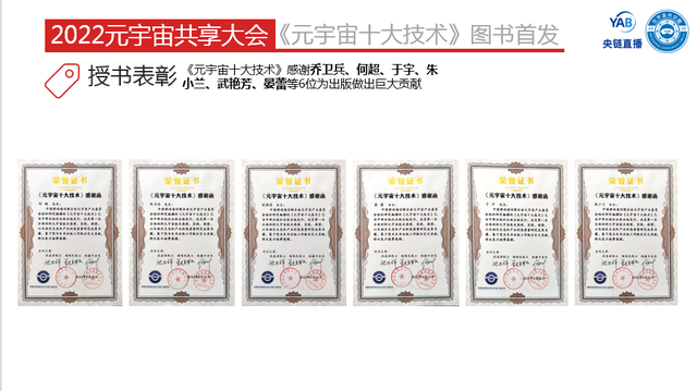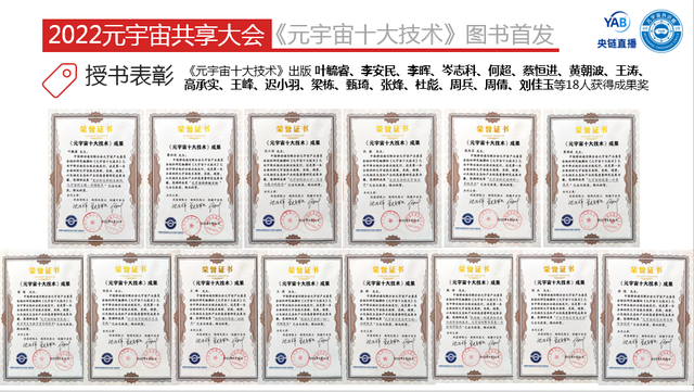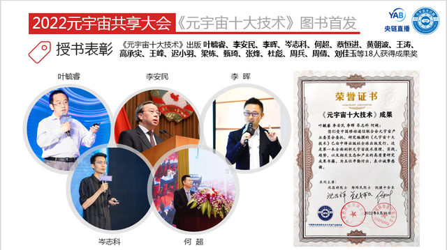 在授书表彰环节,元宇宙产业委为作者、成果人、案例单位和出版编辑颁发证书及图书纪念相框,为图书腰封定制单位授书。包括叶毓睿、李安民、李晖、岑志科、何超、蔡恒进、黄朝波、王涛、高承实、王峰、迟小羽、梁栋、甄琦、张烽、杜彪、周兵、周倩、刘佳玉等18人获得成果奖。