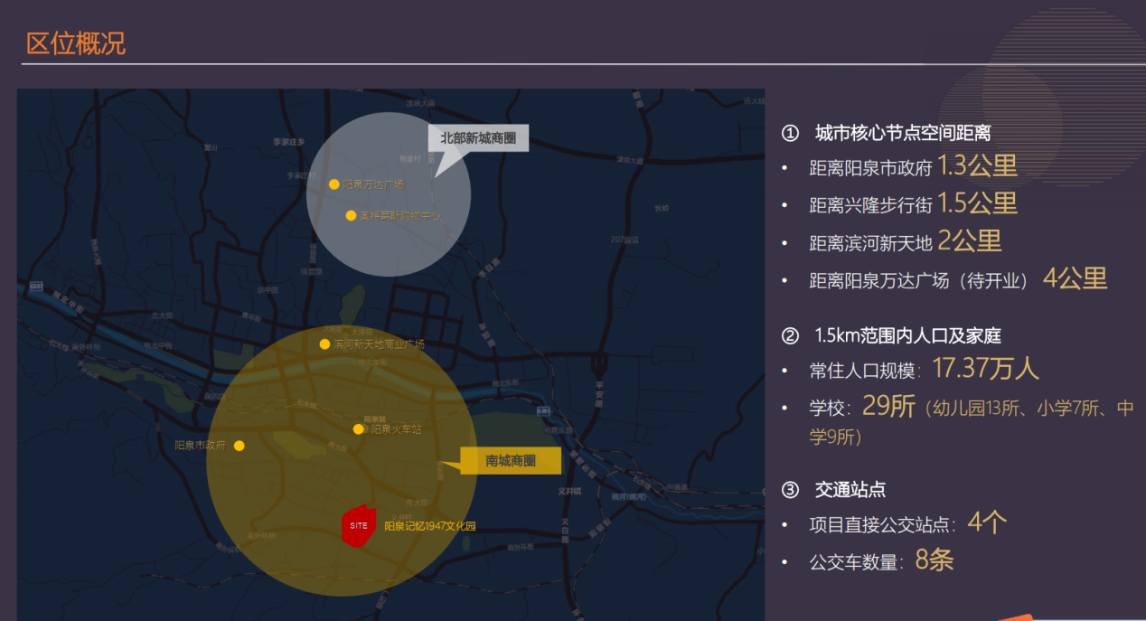 “阳泉记忆•1947”文化园作为山西省首个大型文旅综合体项目,占地144.9亩,位于南庄路118号,与阳泉站等重要城市交通枢纽仅1.3公里。周边1.5公里范围内17万人口,29所学校。周边4个交通站点,8个公交线路,快速串联阳泉城市各个板块商业消费。优越的地理位置与密集的城市人口为阳泉记忆▪1947文化园的升级奠定了良好的基础。