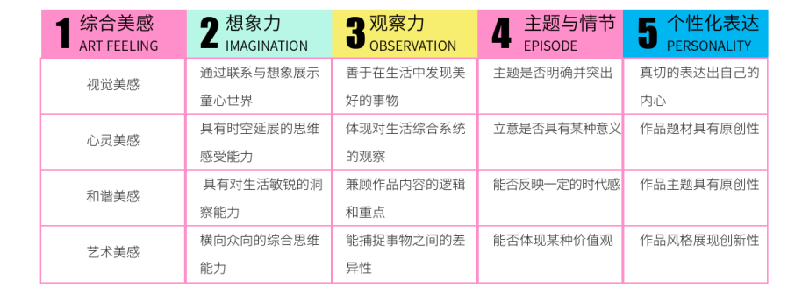 按照本次活动评选宗旨,评选过程重点考虑综合美感、想象力、观察力、主题与情节、个性化表达五个综合标准,并按比例评选,旨在鼓励参与、启迪心智,提高参与者的审美情趣和综合艺术素养为指导。