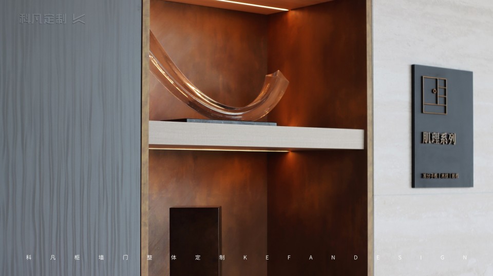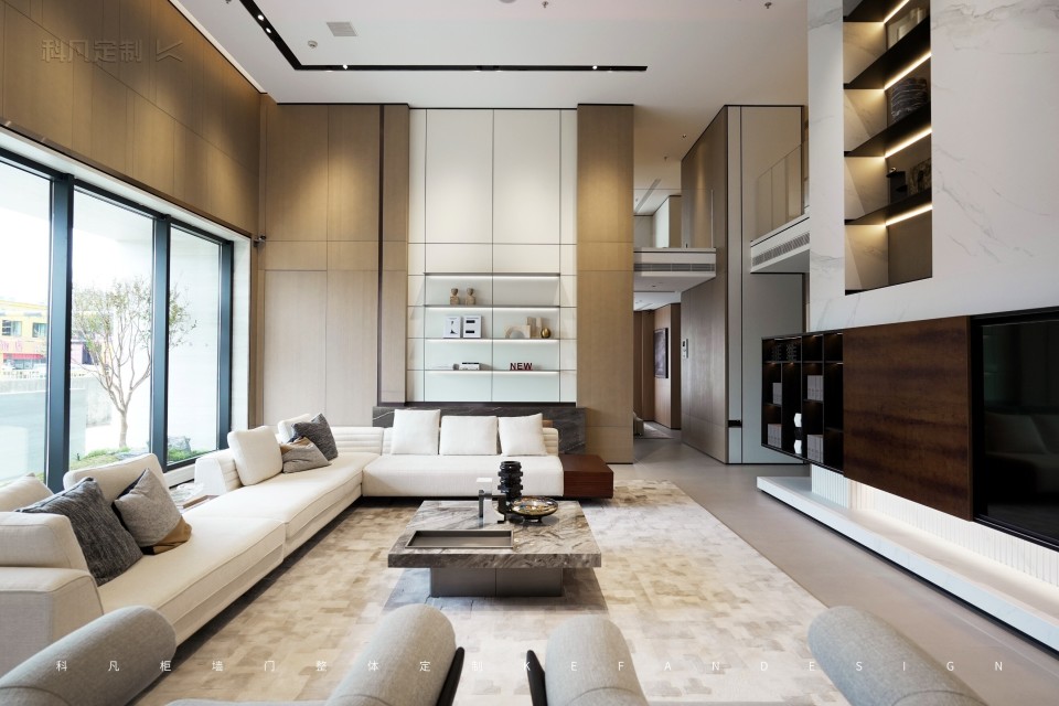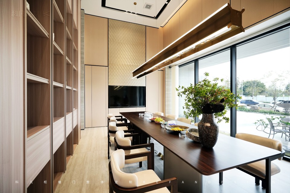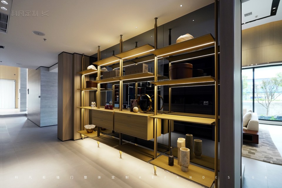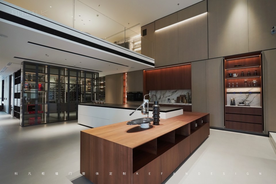 与传统店面不同,科凡定制在「广进店」的空间布局中做了极大的升级。一改往日以空间类别为单位的集中展示,「广进店」将柜类、护墙、内门、灯光和软装五大产品系统组合布局,以整体化设计植入进玄关、客厅、茶室、西厨、中厨、衣帽间和主卧等人居场景。而所有空间根据动态路线设计串联成一个真实的大宅布局,每一个空间再结合进香薰、饮品、炉火等“心机小物”,让消费者从踏入馆区那一刻起,便完全融入在空间的氛围感之中。这种通过产品陈设所带来的更直观沉浸式场景化表达,不仅充分显露科凡“更整体、更高级、更具设计感、更具性价比”的产品价值体系,更是为消费者提供了对未来家居空间的无限遐想与期待,而这,正是家居消费环节中最为重要的情绪价值。