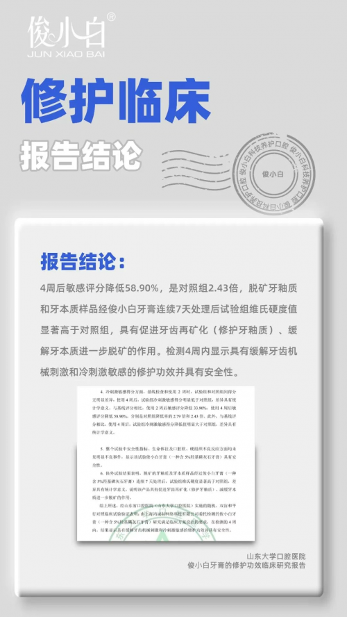 根据备案信息中,山东口腔医院开展的俊小白牙膏的修护功效临床研究报告,报告结论:4周后,有显著“修护牙釉质”、“促进再矿化” 的功效。